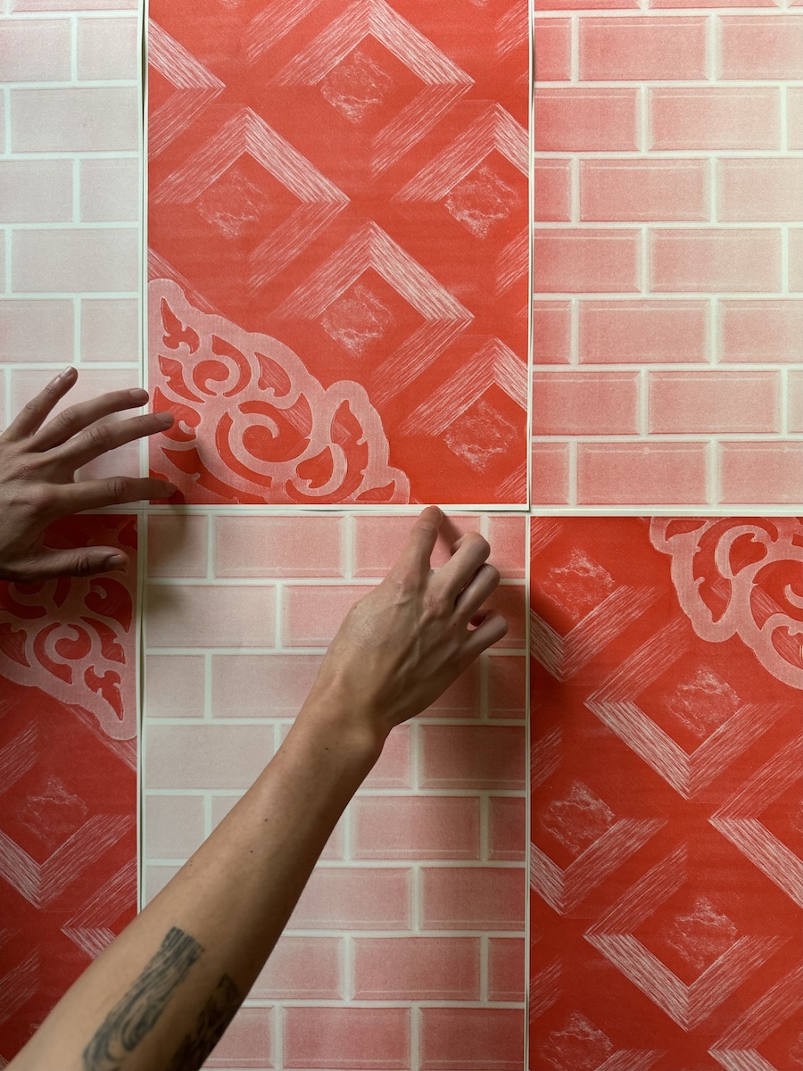 Barrier Wallpaper is a set of repeat-patterned wallpaper, risograph-printed using facsimiles of construction materials — environments approximated, obscured, undone, done-up.